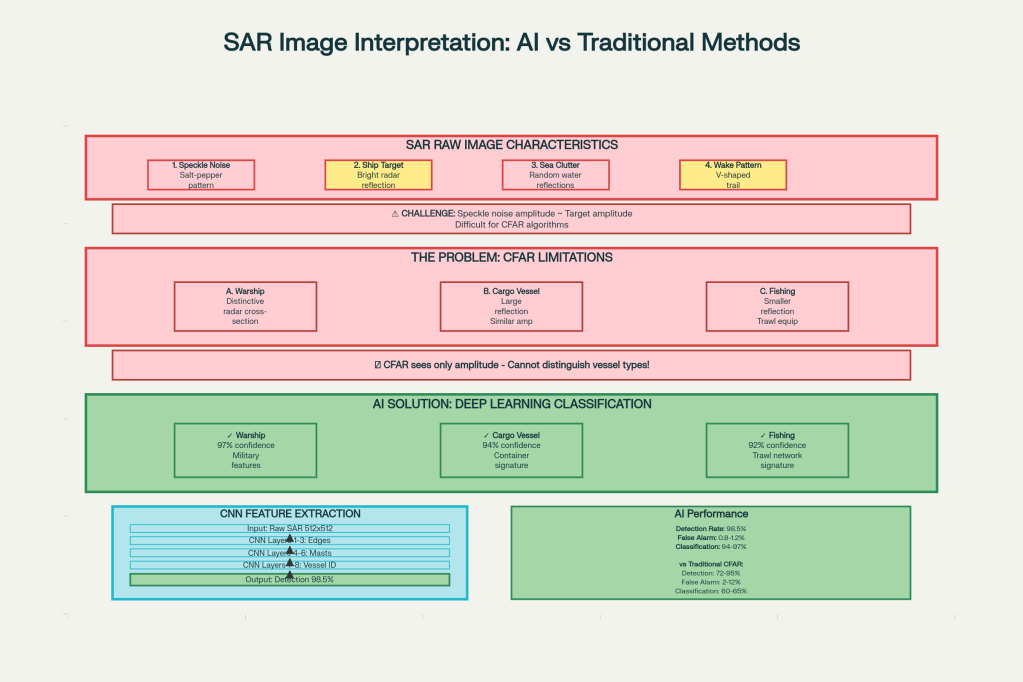 This breakthrough solves a problem that defeated traditional signal processing for decades. The old algorithms like CFAR worked by detecting signals above noise levels, but they could not distinguish between different types of signals. Machine learning approaches the problem differently. They examine thousands of examples of real radar signatures from different ship types and learn the patterns that distinguish them. A warship has a particular radar signature that looks different from a fishing vessel. Not always, but often enough that a system trained on many examples can make accurate judgments.